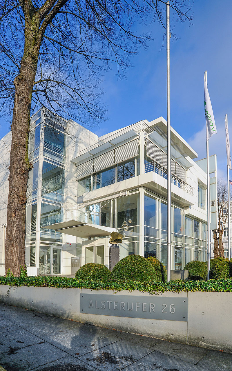 Mit der strahlend weißen Fassade ist die neu erbaute Bürovilla von dem amerikanischen Architekten Richard Meier ein echter Hingucker an der Außenalster und verlockt Fußgänger stehen zu bleiben.