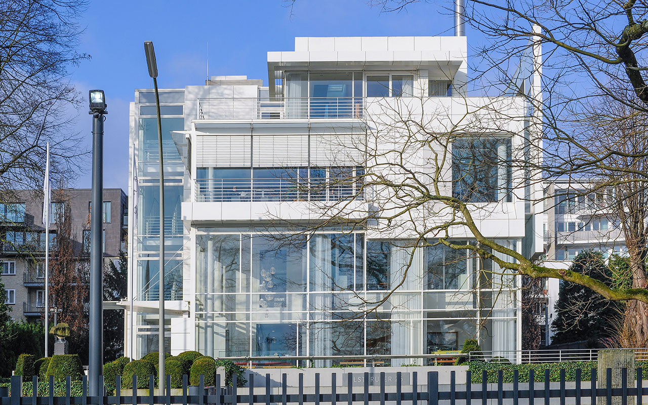 Mit der strahlend weißen Fassade ist die neu erbaute Bürovilla von dem amerikanischen Architekten Richard Meier ein echter Hingucker an der Außenalster und verlockt Fußgänger stehen zu bleiben.