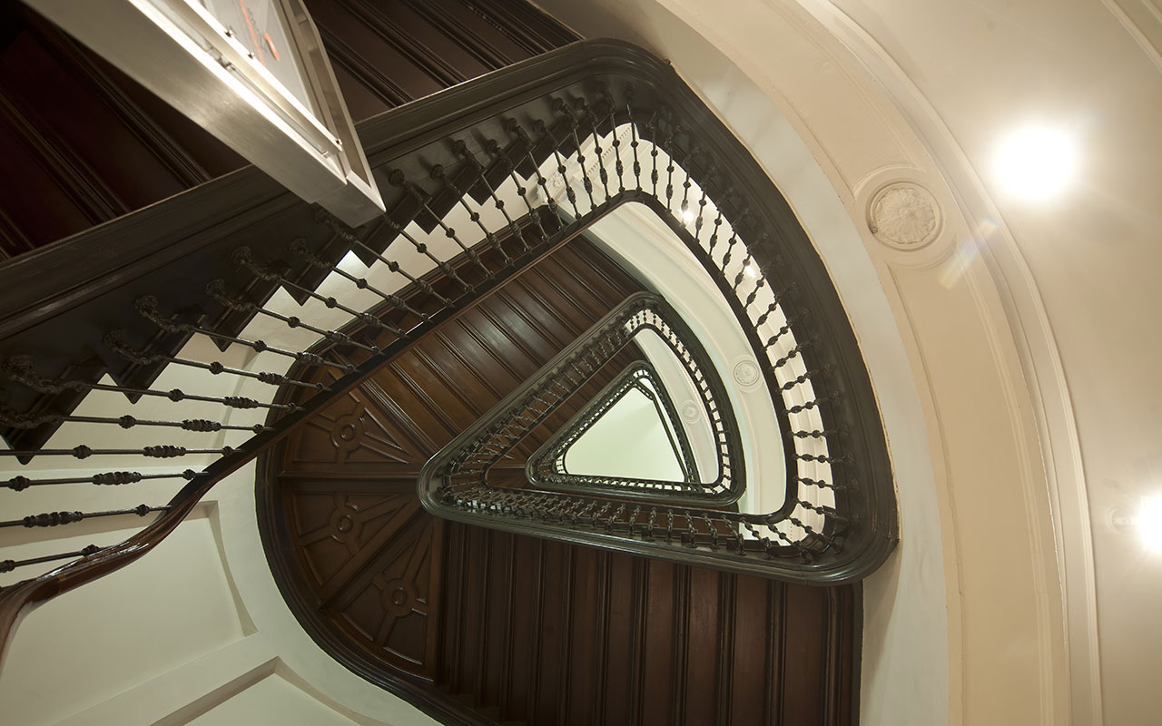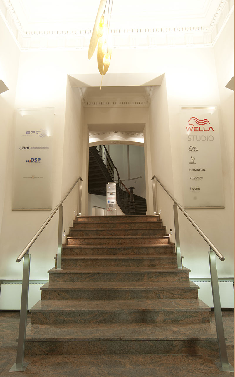 Durch den hochwertig gestalteten Eingangsbereich gelangt man über den modernen Aufzug oder über das imposante Treppenhaus zu den großzügig geschnittenen Gewerbe- und Wohnflächen.